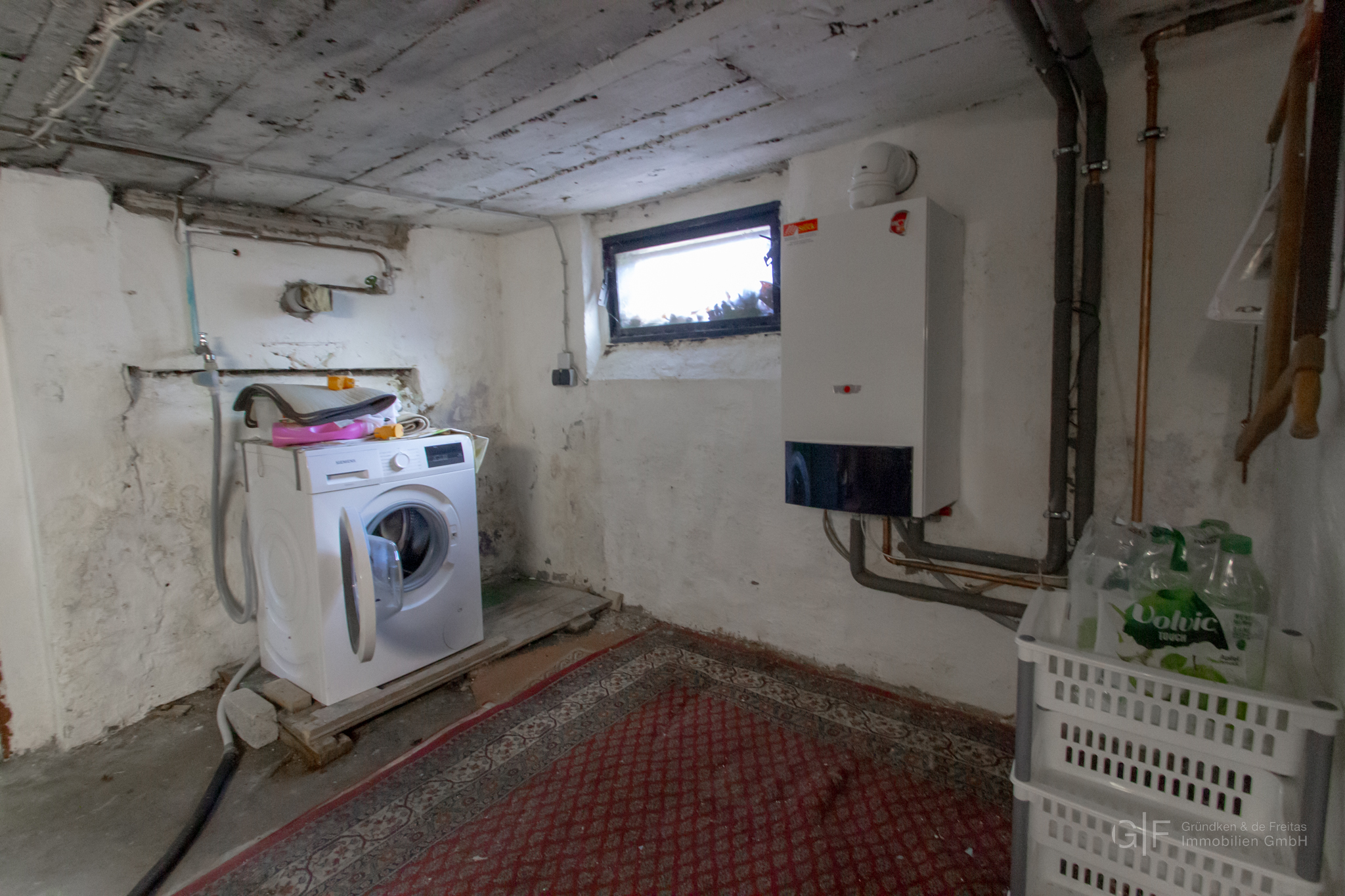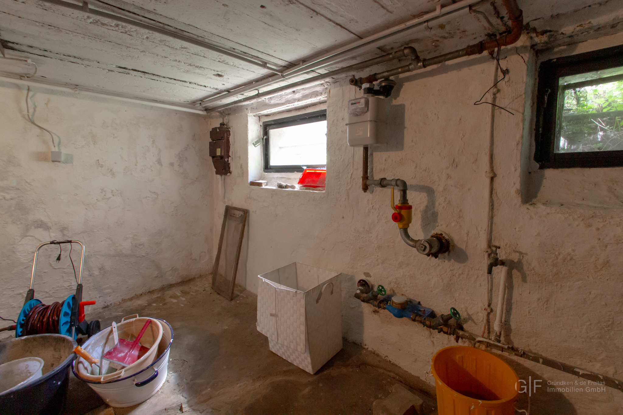 Das Haus ist vollständig unterkellert; der Zugang erfolgt über eine Außentreppe im gepflasterten Hofbereich. Der Keller beherbergt die Hausanschlüsse, die Heizungsanlage sowie Lagerfläche.