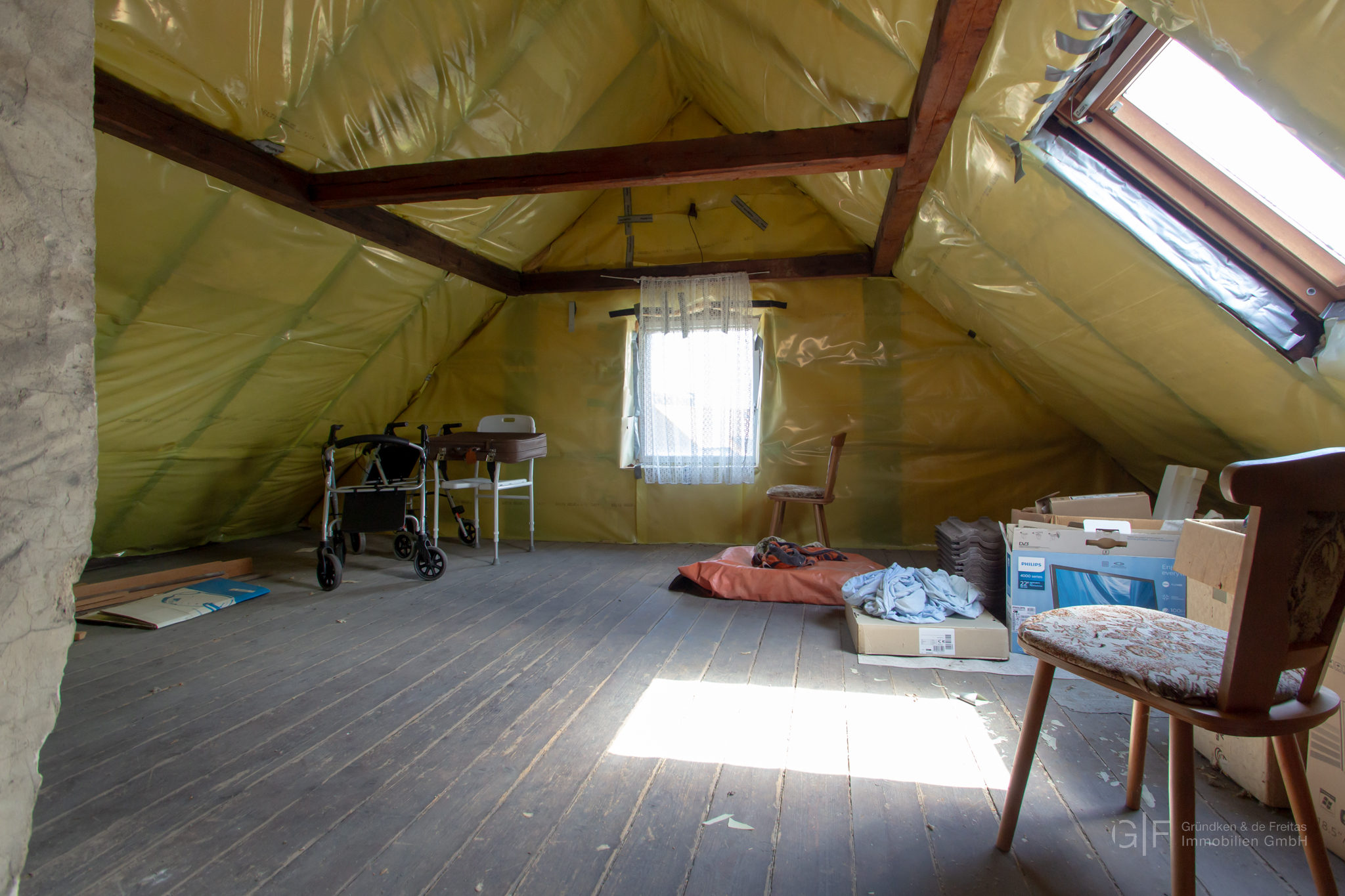 Ein gedämmter Spitzboden, erreichbar über eine Bodeneinschubtreppe, bietet zusätzliche Nutzfläche – ideal als Stauraum oder perspektivisch als Ausbaureserve.